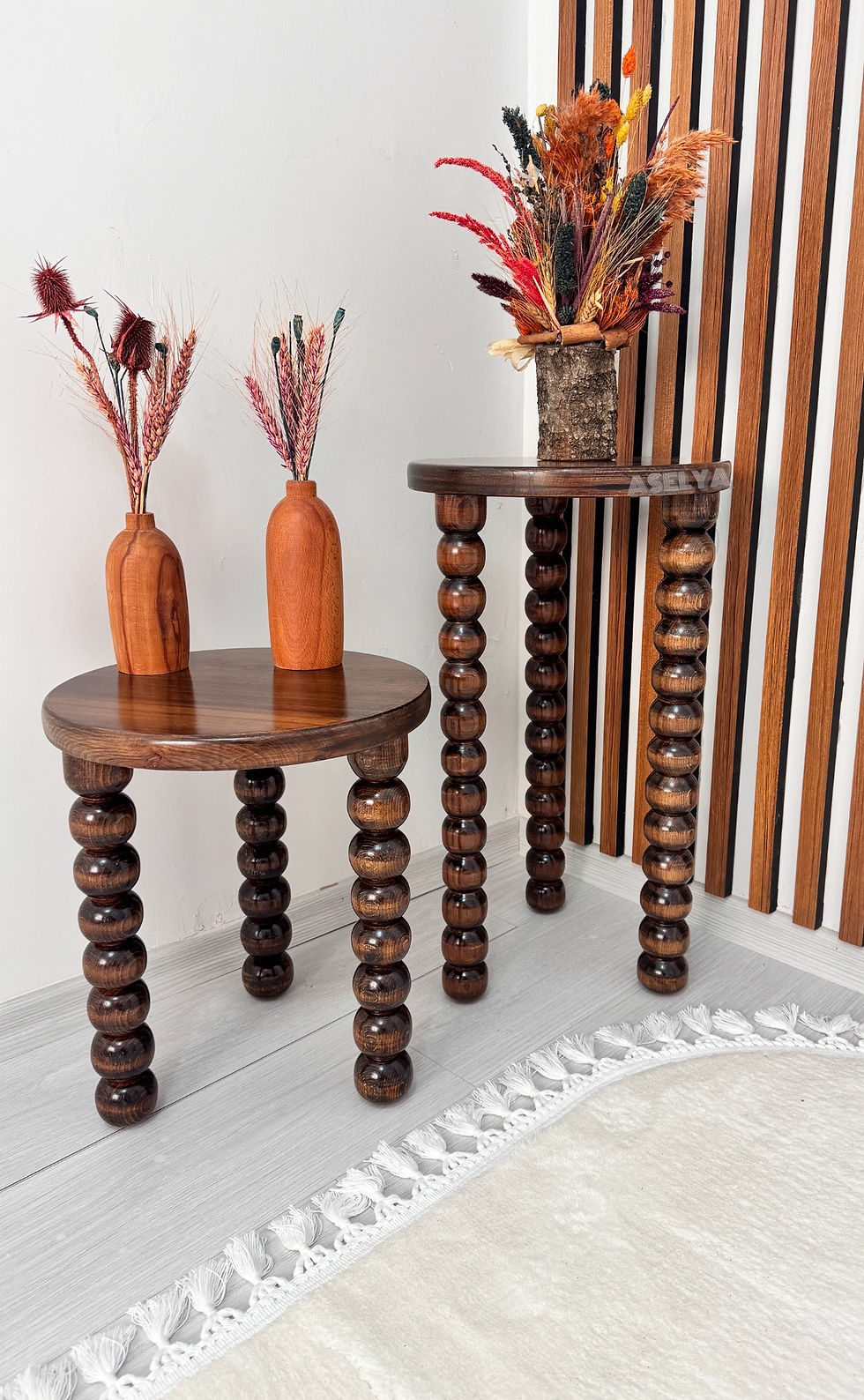 Ahşap 2’li Set Boncuk Ayaklı Yan Sehpa Modern Koyu Ceviz Renk